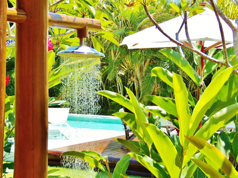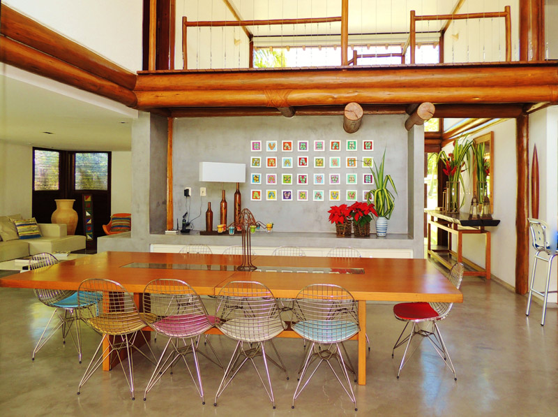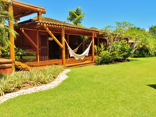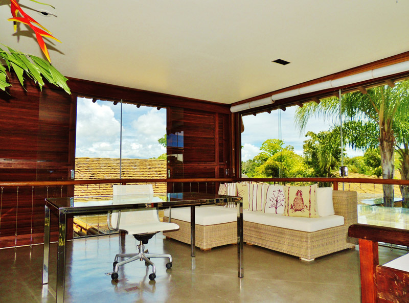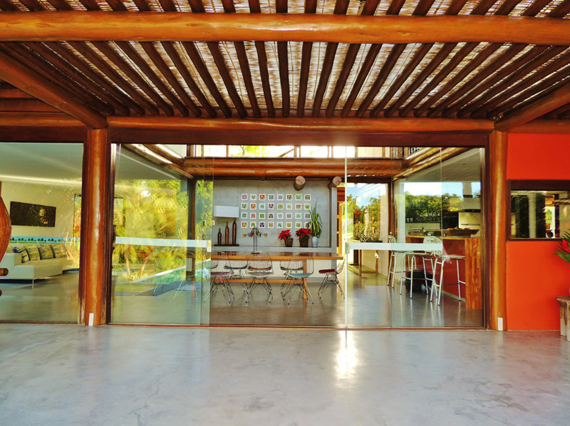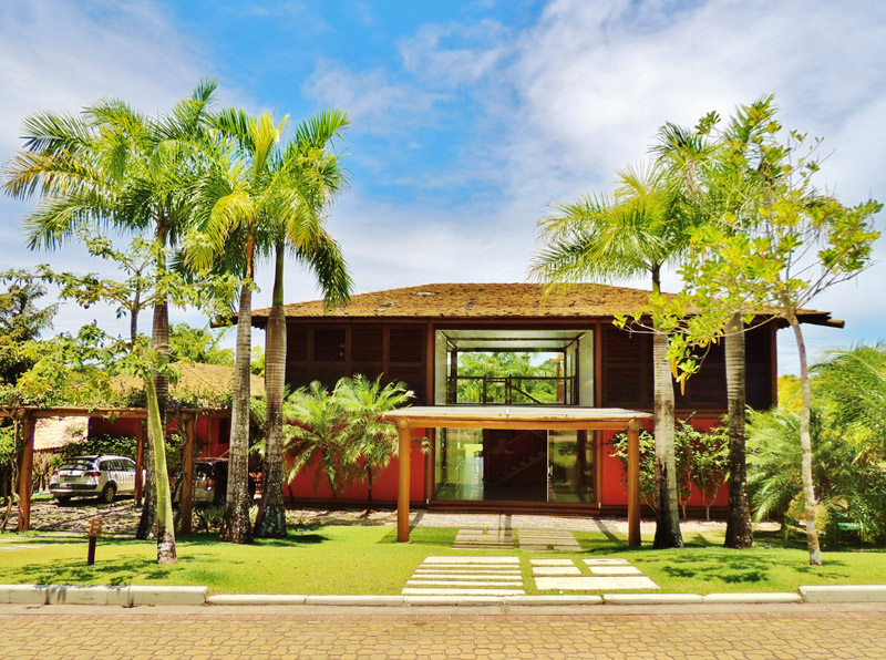 Por exemplo: todas as madeiras e telhas são certificadas; a água utilizada na casa é de poço artesiano, com estação de tratamento; também existe um sistema de captação de águas pluviais para a limpeza da casa e manutenção do jardim.