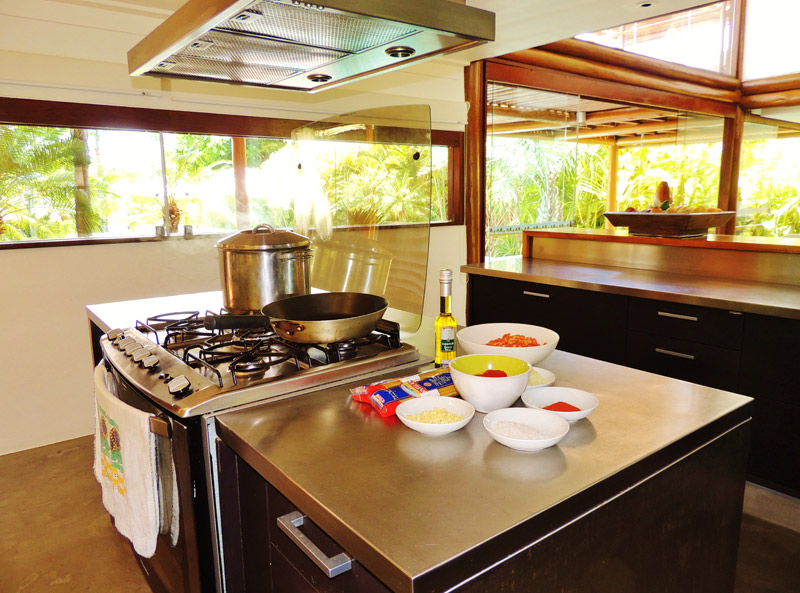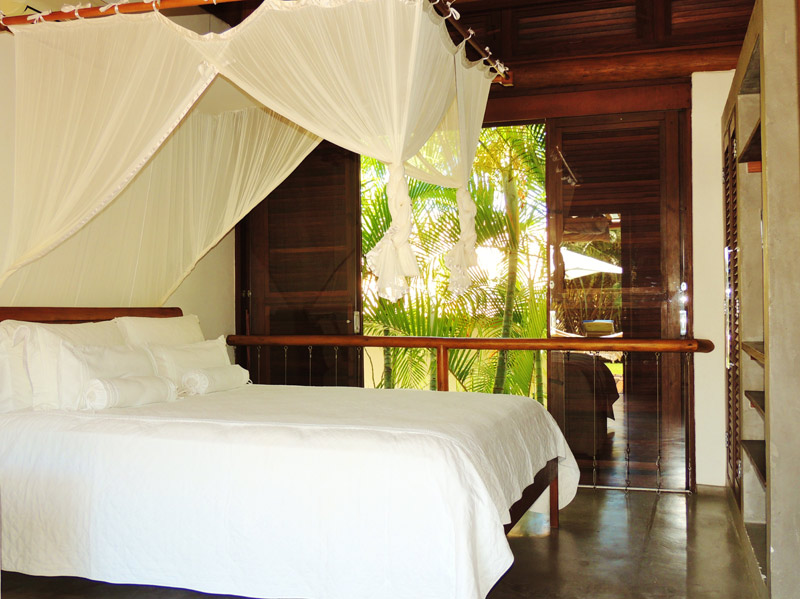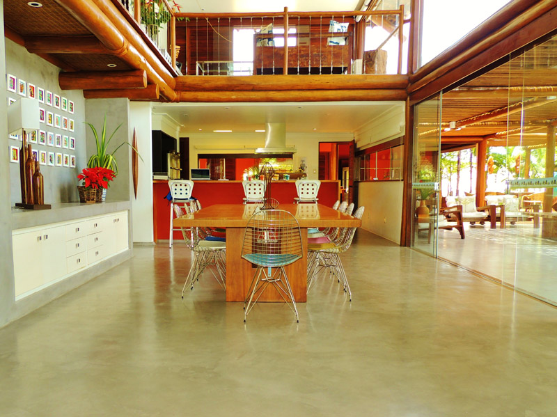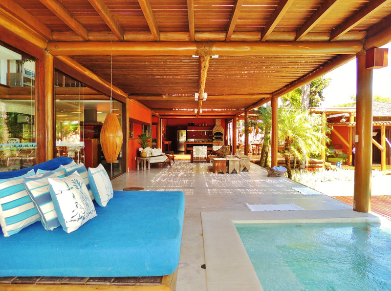 O bloco do meio está a cozinha gourmet e mesa de refeições externa. E descendo pela passarela, o terceiro bloco, dividido em dois bungalos. Cada bungalow suíte tem 30 m².
